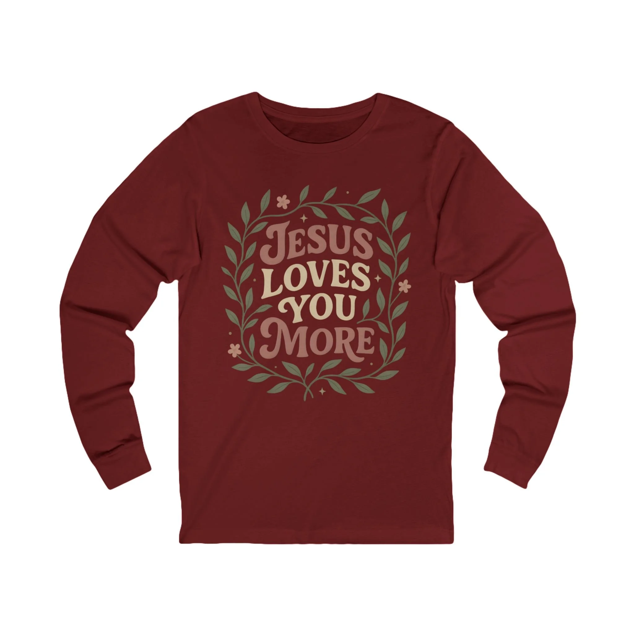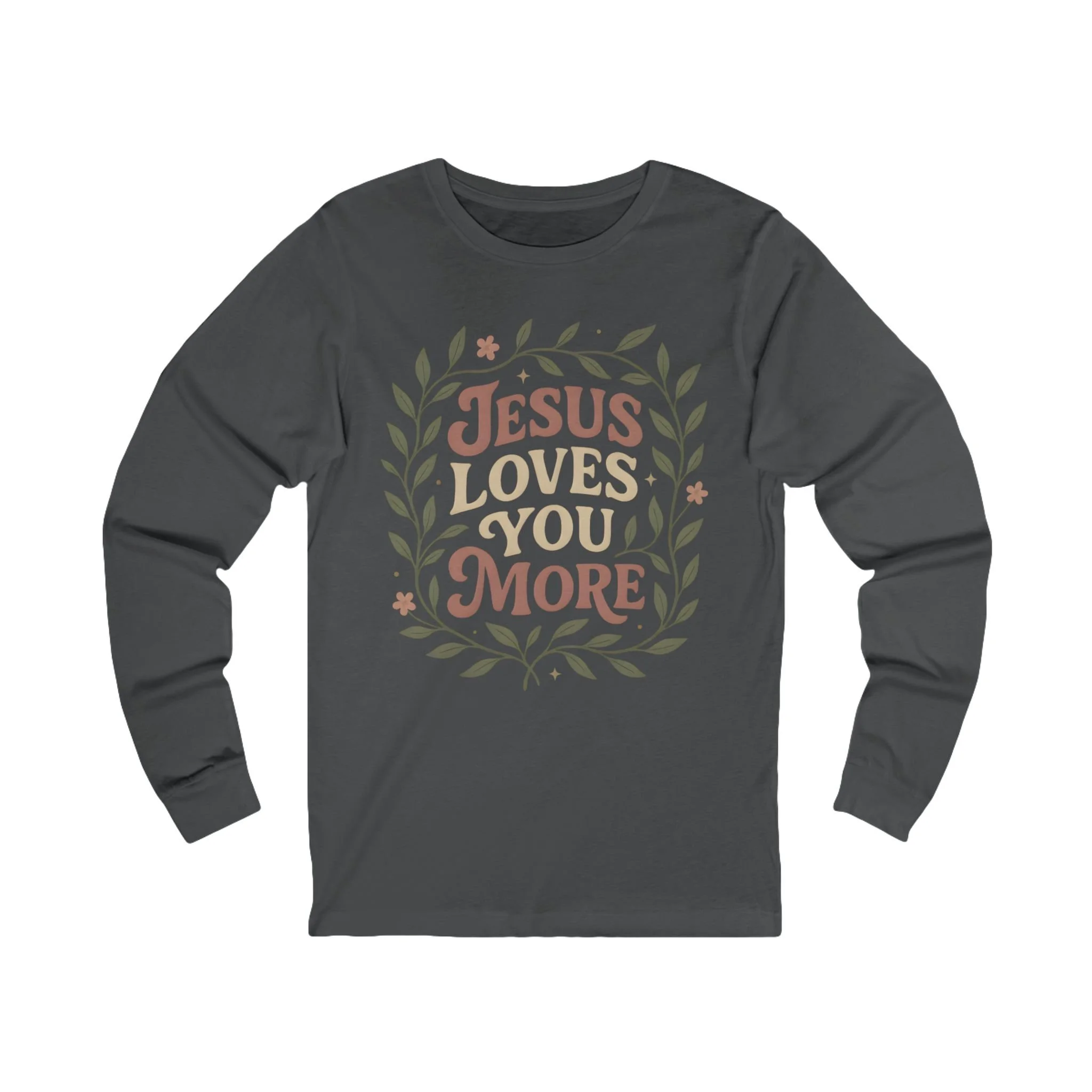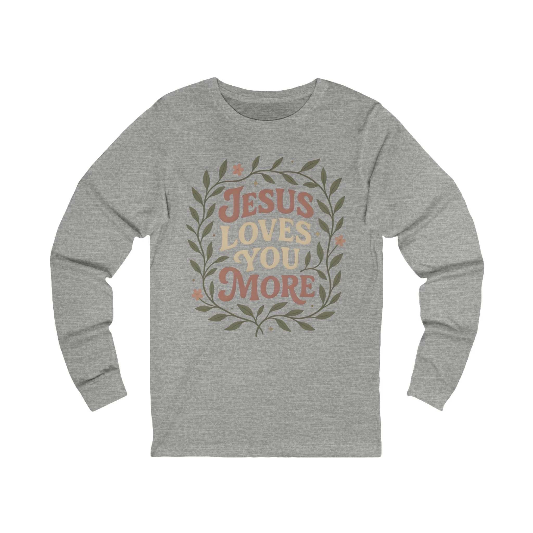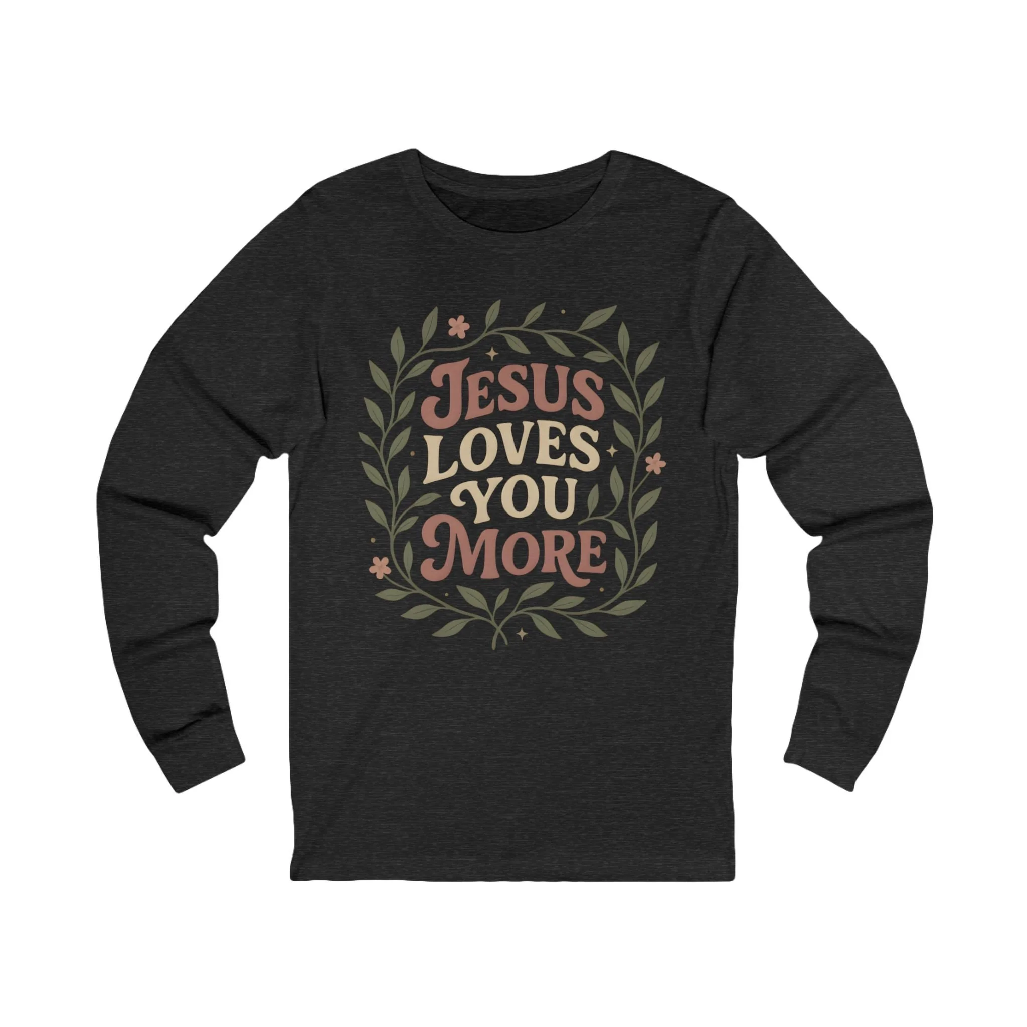 Warm and gentle, this long-sleeve tee carries a quiet message: "Jesus Loves You More," framed in hand-drawn leaves and soft florals. The lightweight, retail-fit silhouette layers easily under jackets or stands on its own for cool evenings at church gatherings, volunteer days, or relaxed Sunday afternoons. The ink has a slightly vintage, muted palette that feels lived-in and approachable — like a neighborly hug written across your chest. It suits someone who wants to share faith with subtlety and warmth, while keeping comfort and everyday wearability front and center.